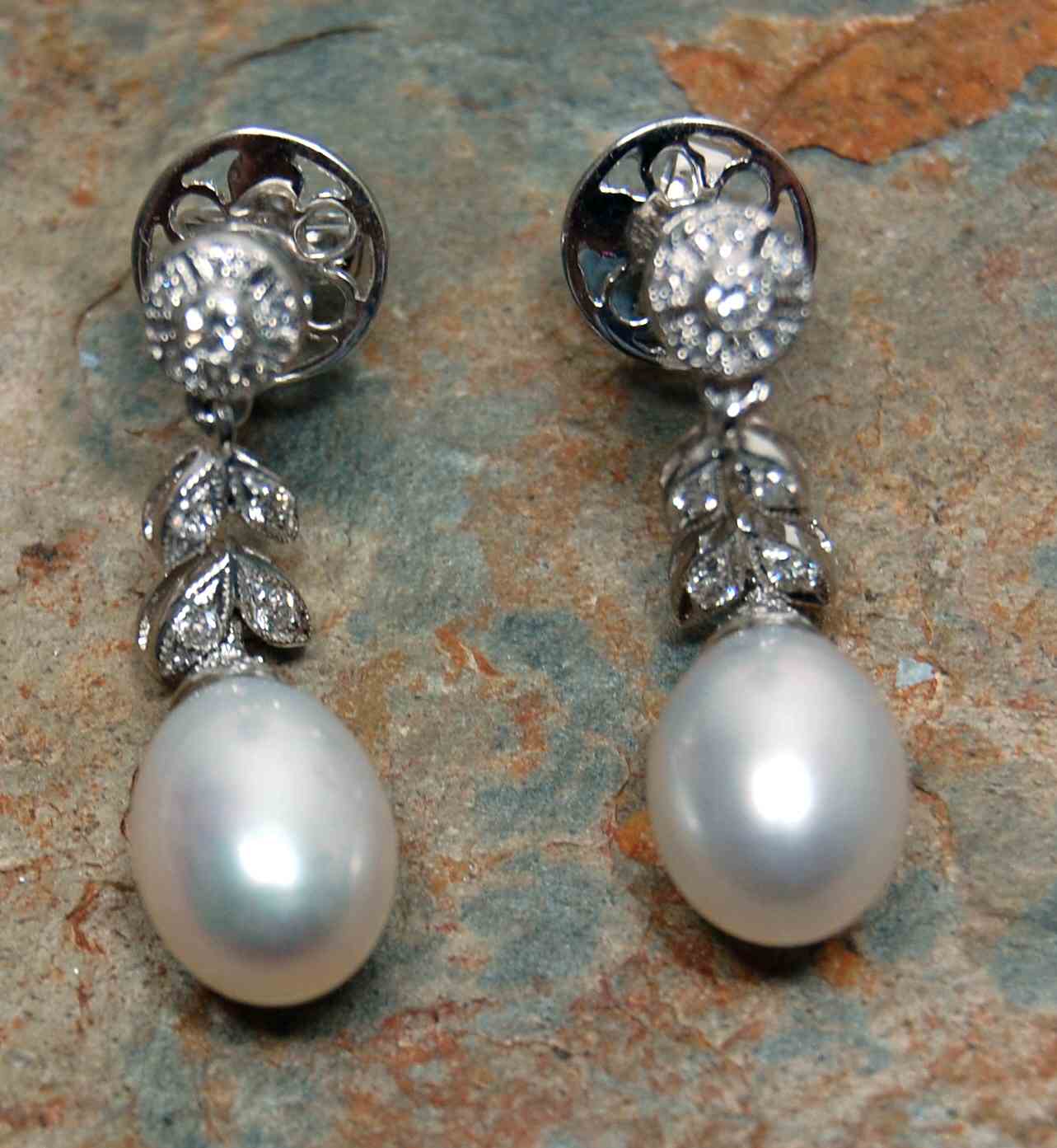 each composed of a circular motif surmounting foliate motifs, set throughout with round brilliant cut diamonds, suspending an ovoid pearl drop, mounts stamped 750 (pearls untested)
