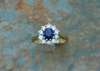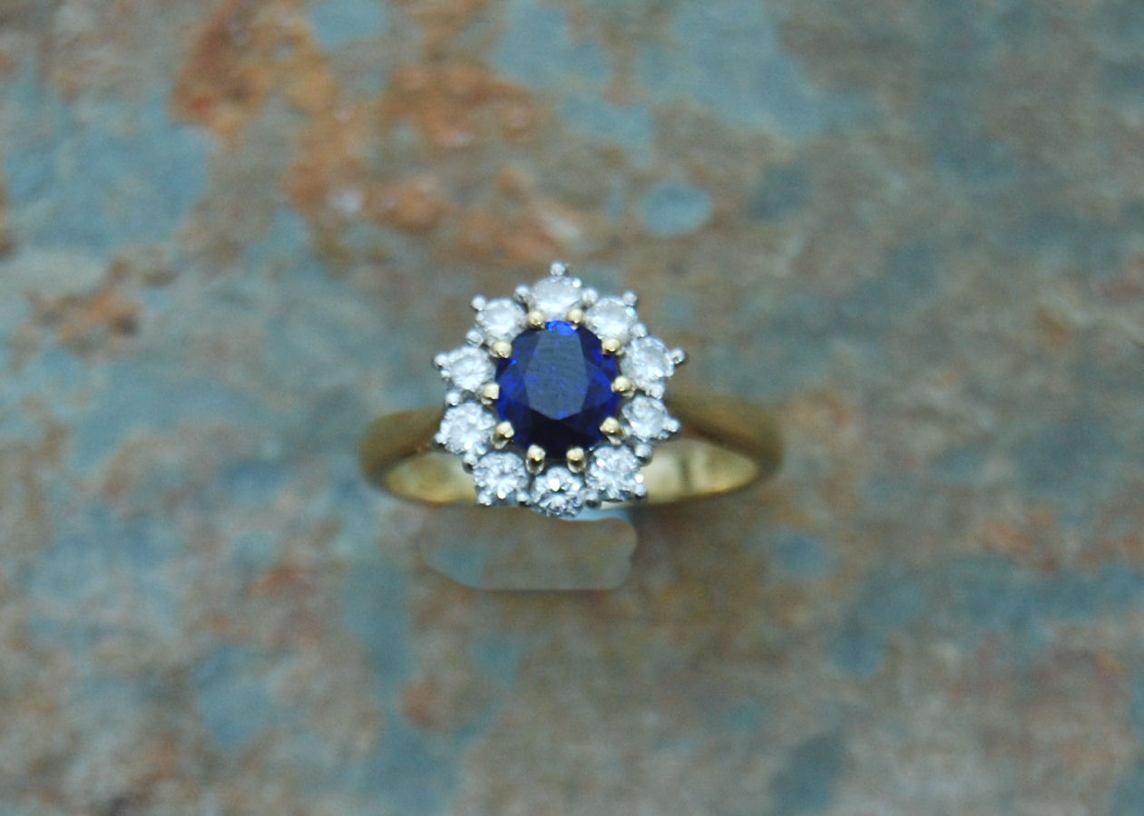 the central claw set oval cut sapphire within a surround of round brilliant cut diamonds