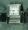 the rectangular dial with black Arabic numerals, monogrammed BD in script to reverse, fitted to a black leather strap with fold-over clasp
