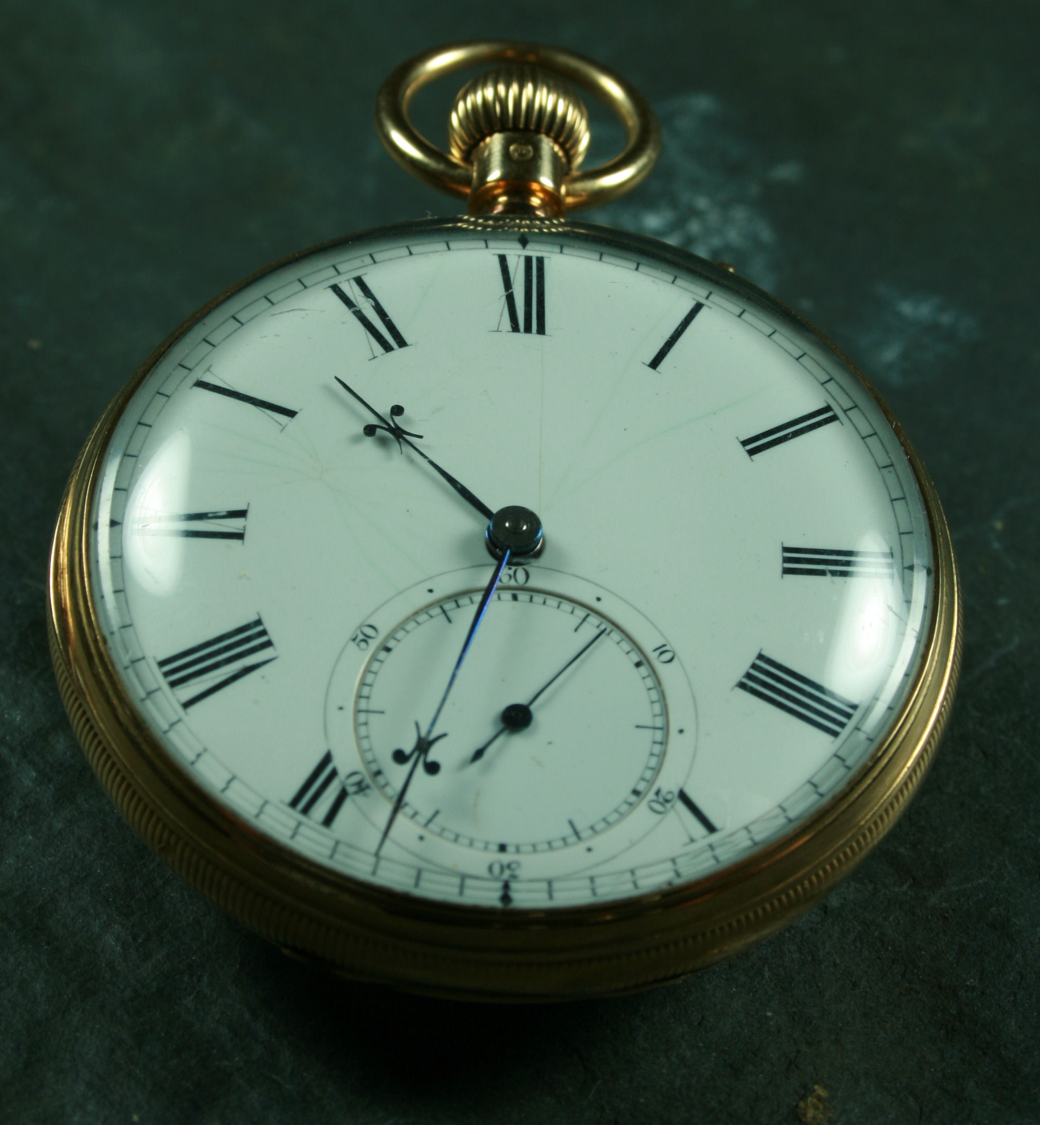 the white enamel dial with black Roman numerals and subsidiary seconds dial with Arabic numerals, with keyless wound movement and engine turned case, monogrammed