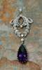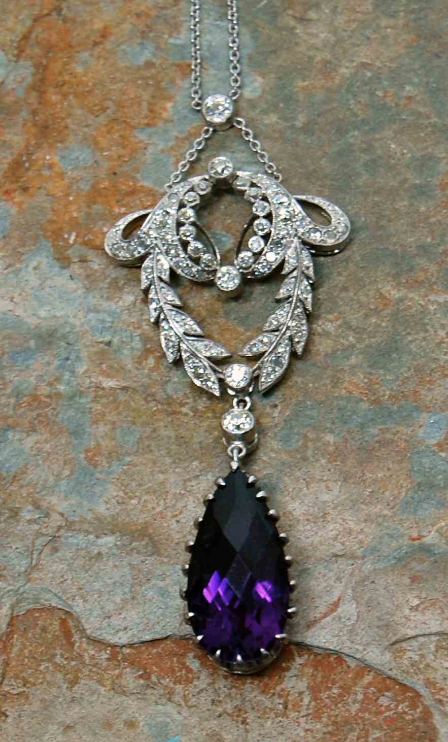in the garland style, millegrain set with graduated round brilliant and rose cut diamonds, suspending a large claw set briolette cut amethyst drop, the whole suspended from a fine trace link chain stamped 750 ITALY