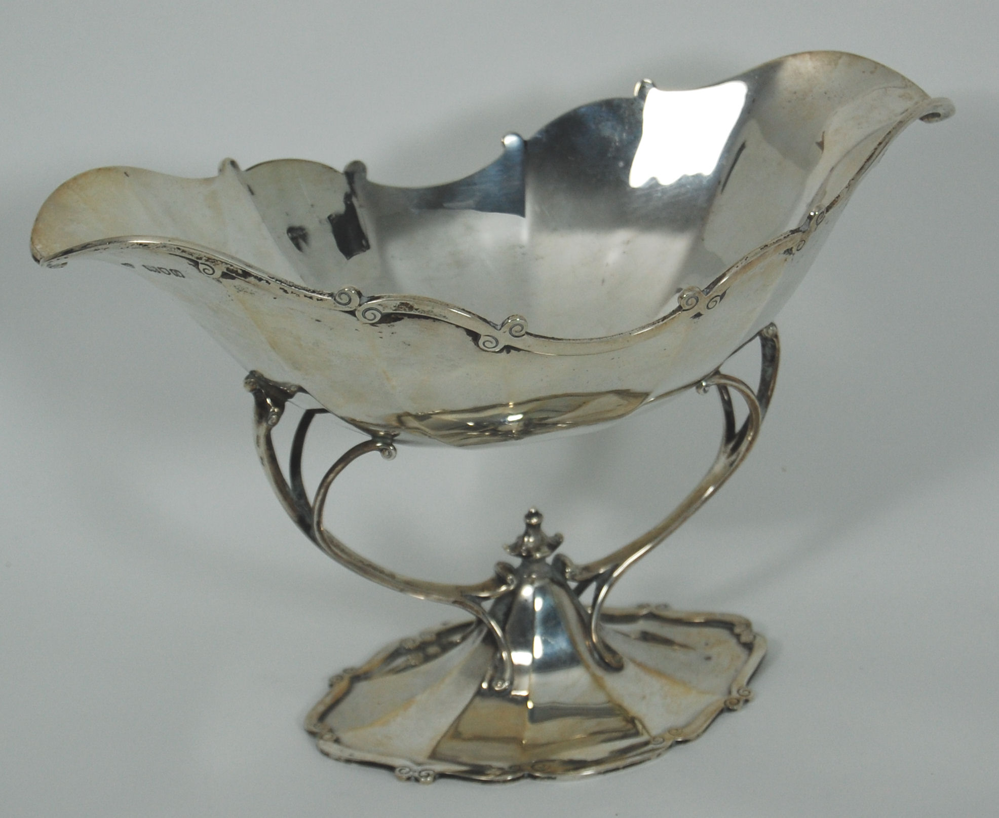 by Goldmsmiths and Silversmiths Company, London 1909, the shaped oval bowl with applied scroll border on open scroll supports to a spreading foot rim