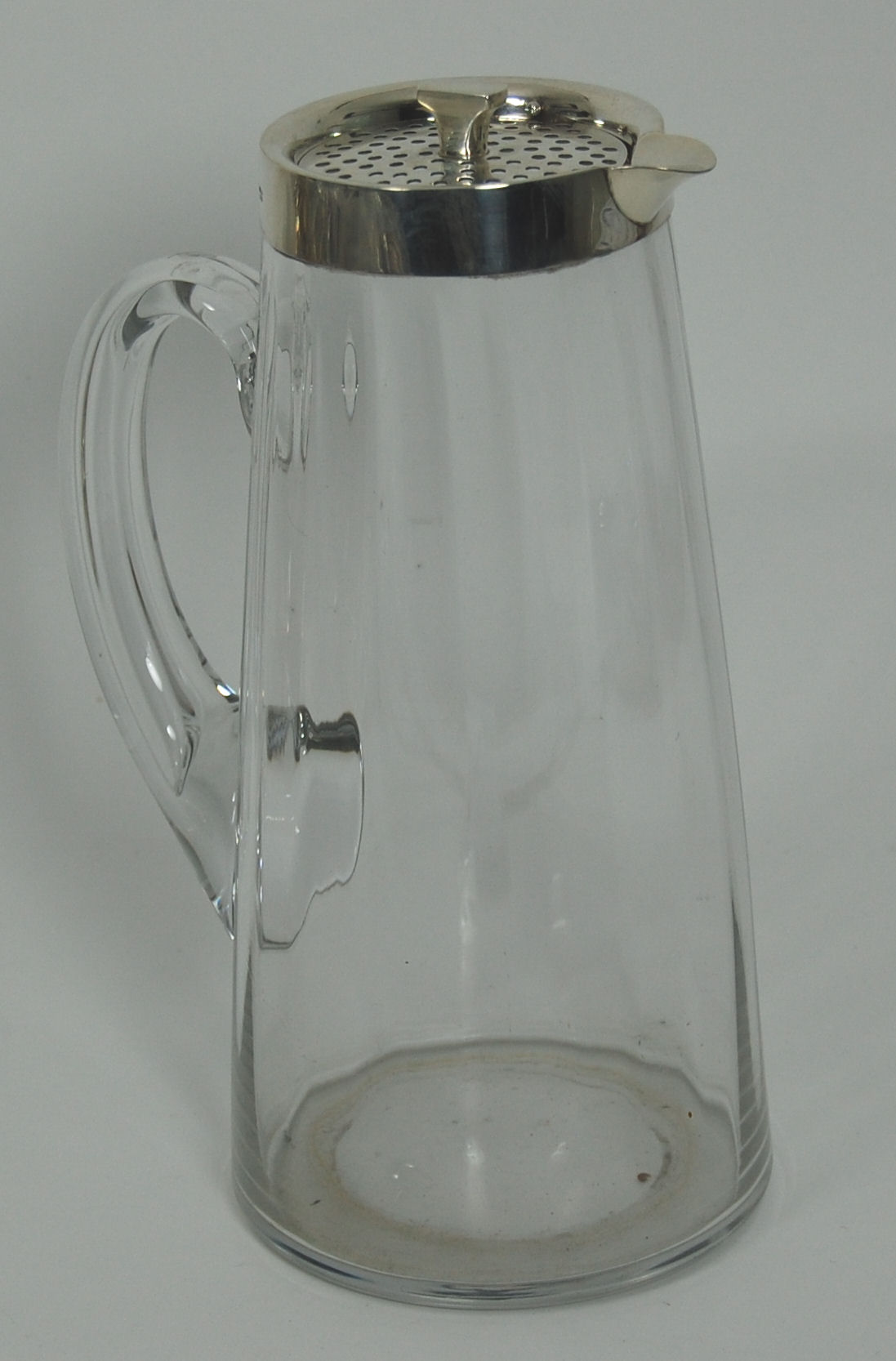 by Asprey and Company, Birmingham 1925, the tapered moulded glass body with simple C handle, plain mounts and pierced strainer