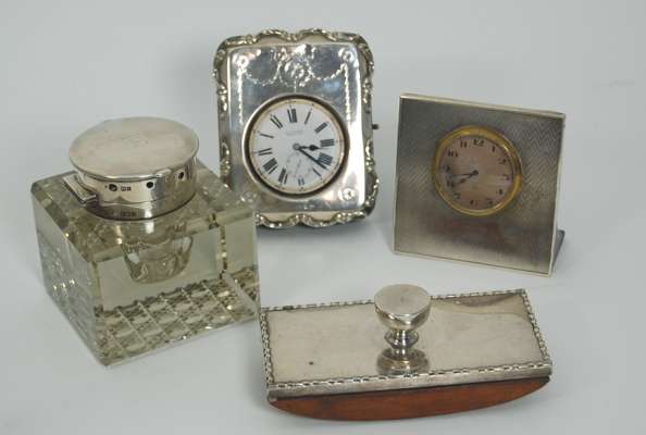 by J Viner, London 1904, the square body with cut base and plain mounted hinged cover; a pocket watch desk stand, of shaped rectangular outline with floral and C scroll border and engraved swag motiffs, by Walker and Hall, with white metal pocket watch; a desk clock Birmingham 1928 with painted circular dial within an engine turned decorated stand; together with a desk blotter of typical form with simple swag border (4)
