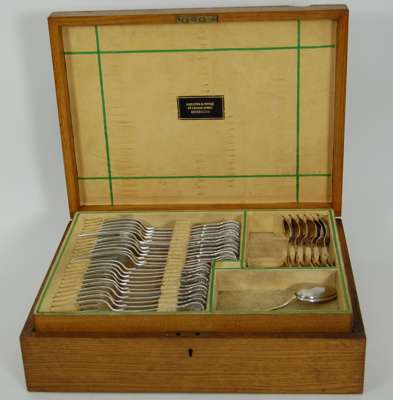 various dates and makers (mainly MacKay and Chisolm Edinburgh), comprising teaspoons, table and dessert forks, dessert and table spoons, contained within fitted case (qty)