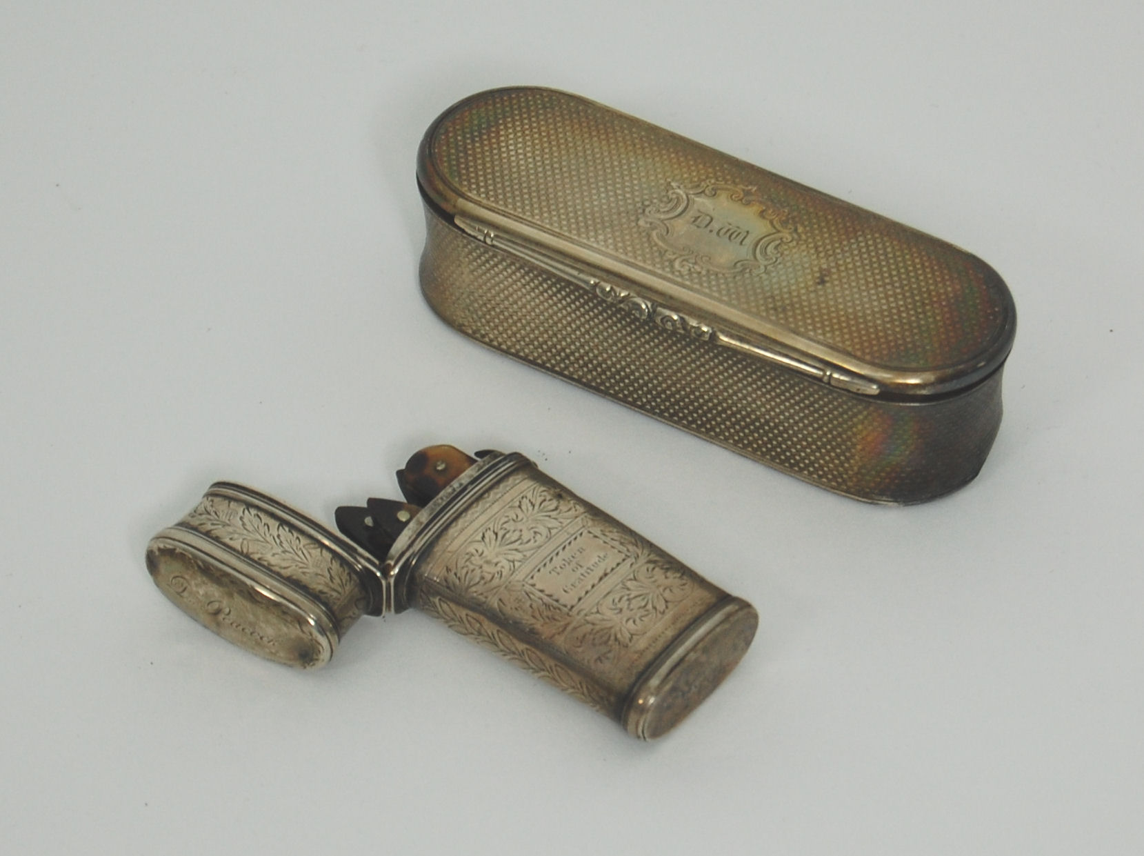 by J Nasmyth & Company, Edinburgh 1850, of rounded rectangular form with engine decoration and C scroll cartouche with engraved initials DW, with cast foliate thumb piece; together with a lancet case makers mark indistinct (possibly Scottish) of typical form with engraved foliate and thistle decoration, the hinged cover revealing four tortoise shell knives (2)