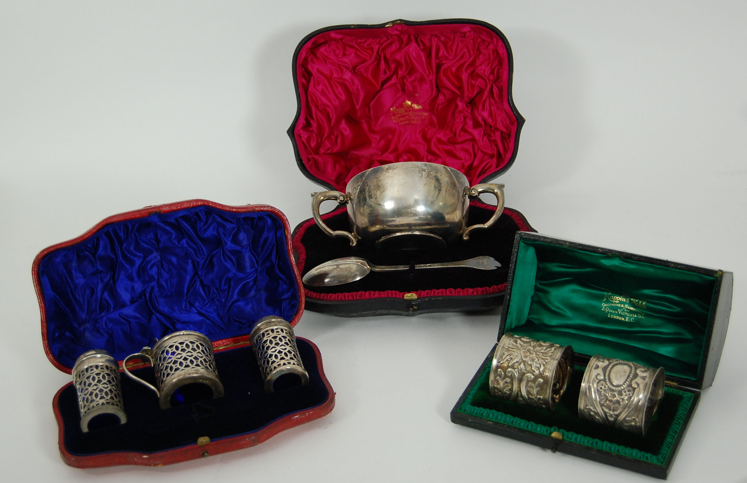 by William Hutton & Sons London 1896, comprising covered mustard and two pepper casters, each with blue glass liners and pierced bodies; a cased pair of napkin rings with embossed scroll mask and leaf designs London 1896; together with a christening set comprising two handled bowl and matched trefid spoon London 1898 and 1900 (3)