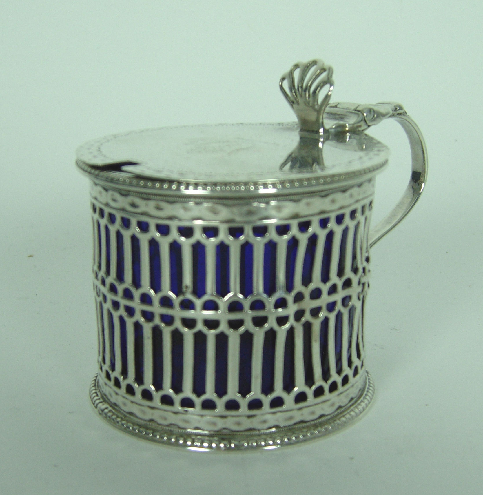 by Phillips Freeman, London 1776, of typical drum form, with reticulated body and beaded borders, the flat hinged lid with pierced scalloped thumb-piece and engraved crest, with simple C-scroll and bead decorated handle