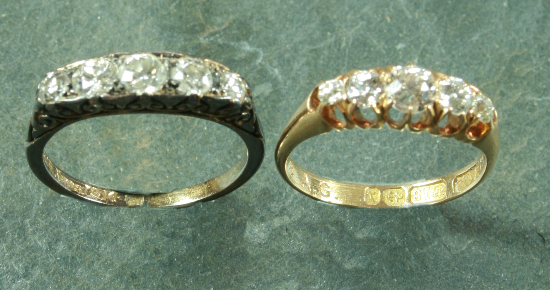 claw set with graduated old European cut diamonds; also another 18ct gold mounted five-stone diamond ring (2)