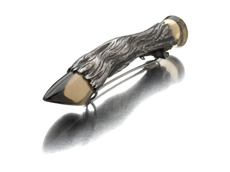 of tapered design with naturalistic finish, with smoky quartz cabochon set pommel and carved hoof