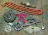 to include an Omega lady's gold wrist watch; a heart shaped locket with chain; a carved ivory pendant; two coral bead necklaces; assorted Scottish brooches; an Argyll & Sutherland badge and other pieces (Qty)