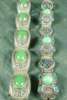 one alternately composed of pierced circular and curved rectangular panels, decorated with shades of blue enamel, circular cut turquoise coloured cabochons and filigree work; the second composed of shaped oval filigree decorated panels each set with an oval cut green cabochon