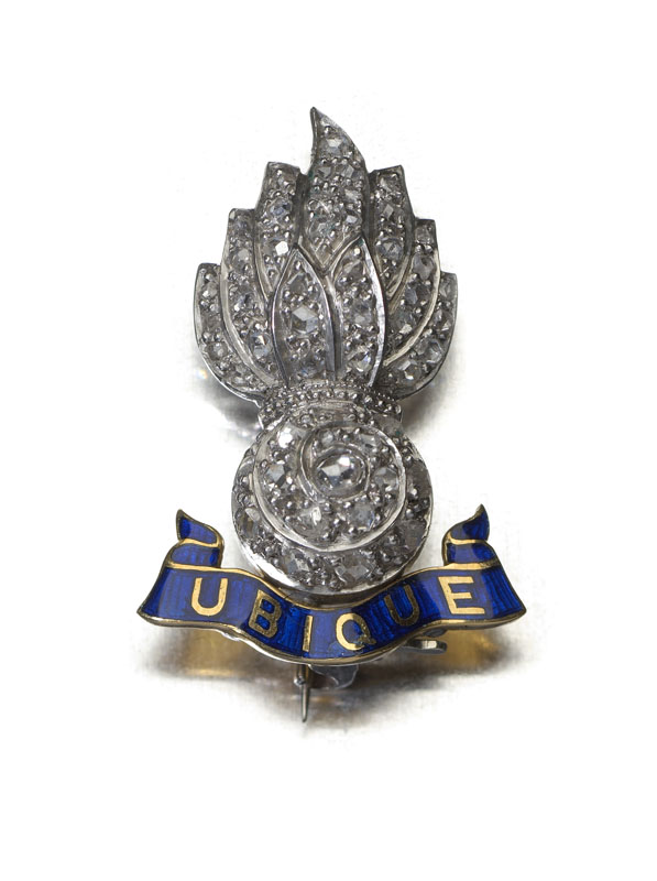 designed as a grenade, set throughout with rose cut diamonds above a deep blue enamelled banner inscribed UBIQUE, contained in a fitted case stamped GARRARD & Co. Ltd