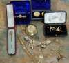 to include a cased stickpin, with half-pearl and diamond set crescent shaped terminal; a cased bar brooch applied with two swallows with ruby cabochon set eyes to a knife bar; another cased bar brooch set with seed pearls; a cased pair of monogrammed dress buttons; assorted chains, bar brooches and other pieces, contained in a green leather jewellery box (Qty)