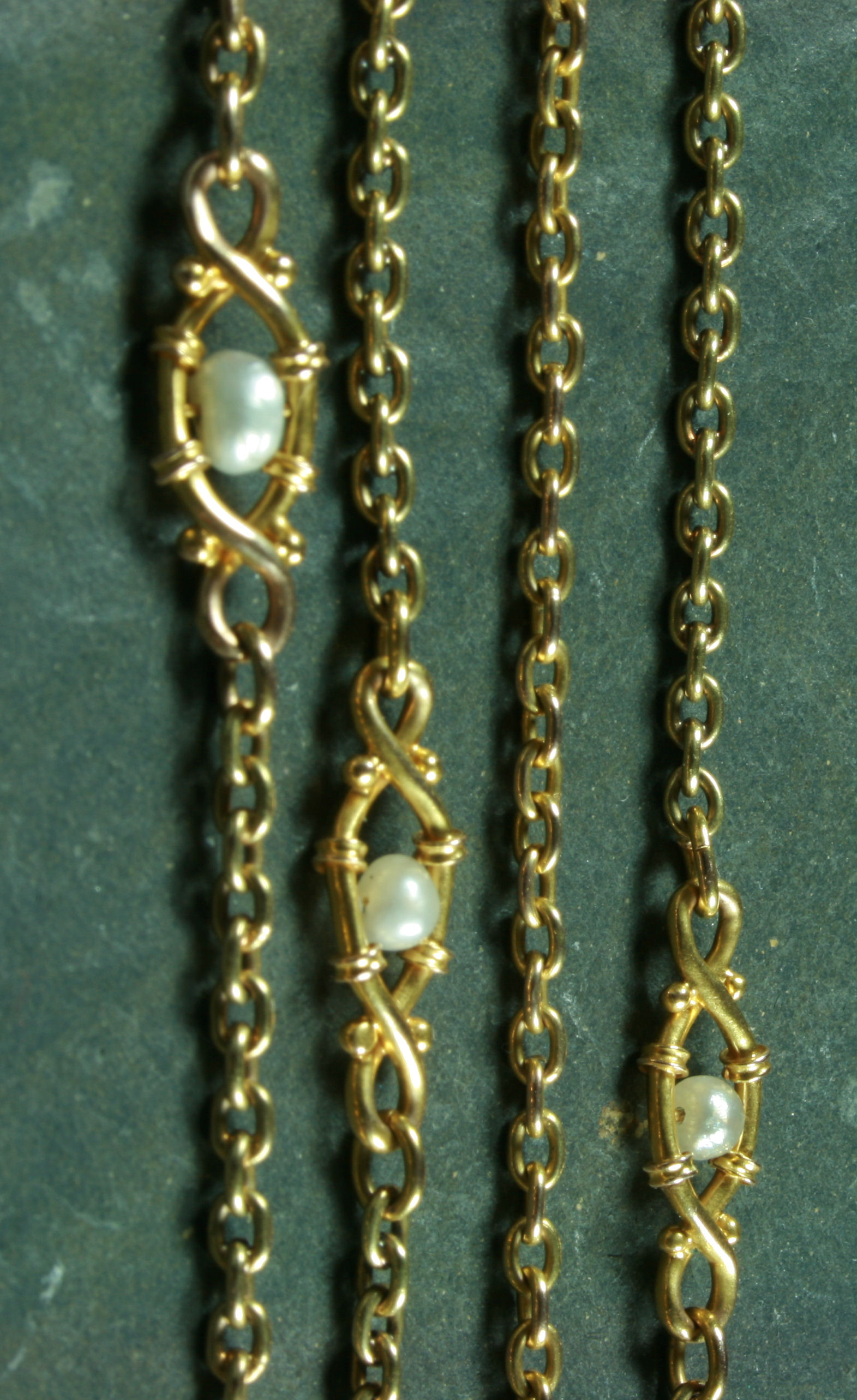 composed of belcher links, set at intervals with freshwater pearl set scroll form links