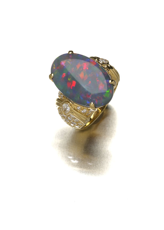 the central claw set oval cut black opal cabochon, flanked to either side by a collet set pear cut diamond, additionally pave set to the shoulders with graduated round brilliant cut diamonds, mounts stamped K18