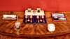 an Edwardian silver mounted glass table bell; an art deco vesta case; a cased set of silver waistcoat buttons; a lighter; a silver framed travelling timepiece; a mustard pot and cover; a cased set of six William IV fiddle pattern teaspoons and an associated pair of George III sugar tongs; a cased EPBM tea caddy and infuser spoon; a cased pair of horn handled fish servers