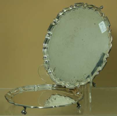 Hamilton and Inches, Edinburgh 1939 of circular form, moulded rim and on three scroll feet, together with a larger waiter, similar and raised on three hoof feet