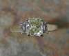 the central corner claw set princess cut diamond of a champagne yellow hue, flanked to either side by a trap cut diamond, mount stamped 18K 750