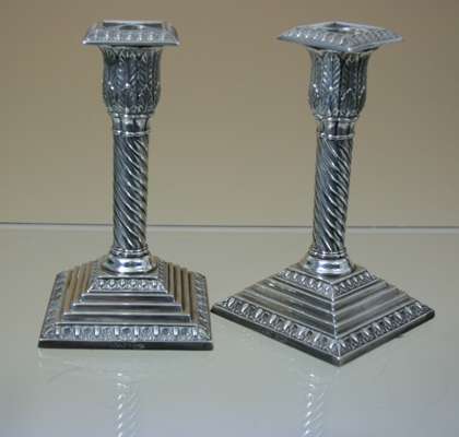 Walker and Hall, Sheffield, 1903, the square sconces onto leaf clasped sticks with wrythen columns and onto stepped square bases