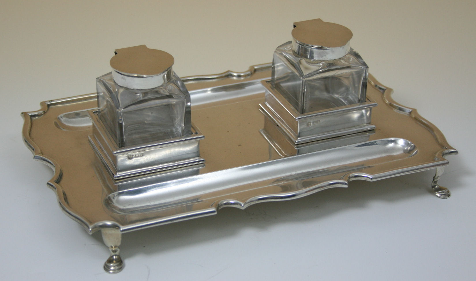 London 1897, of rectangular form, moulded rim with incurved detail, two lidded glass inkwells, and two pen troughs, all raised on cabriole legs with hoof feet