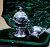 JW/FCW. London 1902, the condiments of beaten spherical form with domed lids, pierced and with vase finial, the whole with three scrolling arms down to the spool foot, similarly beaten, all contained in a shaped and fitted case retailers name of Hall & Co. Manchester