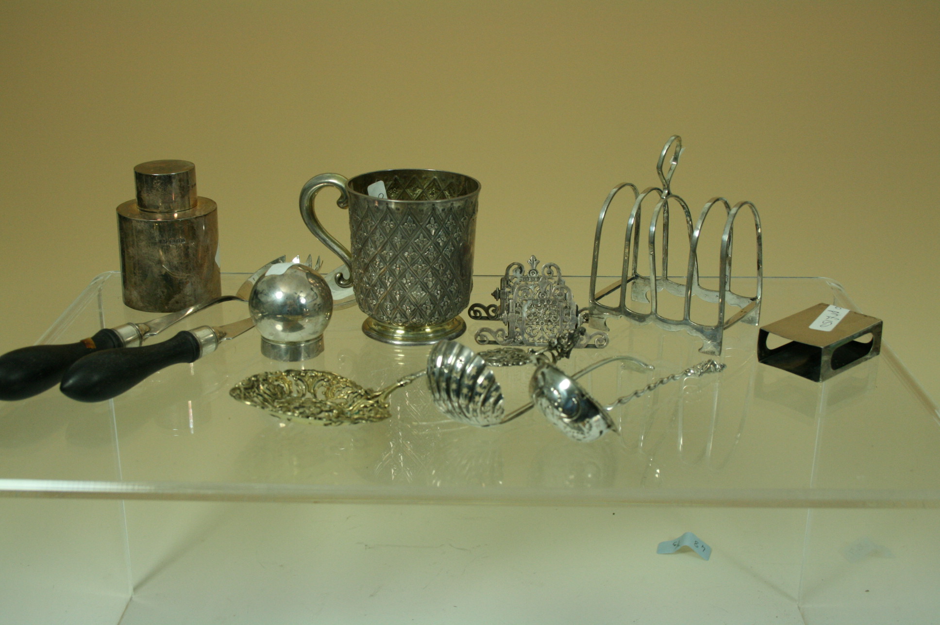 EKR, London 1862, of cylindrical form, with hand chsed and engraved diaper and flower heads, plain scroll handle, blank cartouche, spreading rim foot, together with a toast rack; a pair of woden handled salad servers; a Dutch fancy spoon; a buckle; a bottle cover; two sugar sifters on with Onslow pattern handle; a vesta cover; a cylindrical tea caddy (qty)