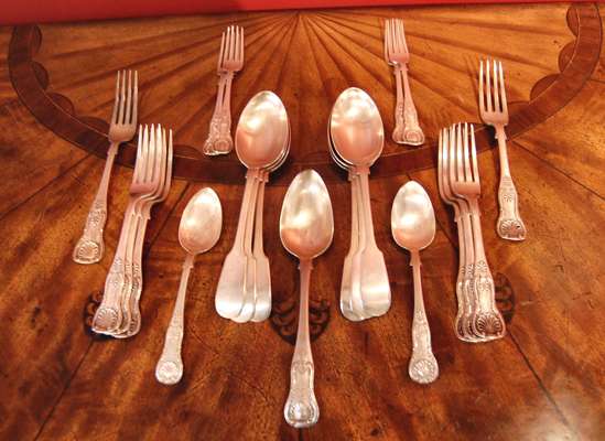 various dates and makers, comprising; six fiddle pattern table spoons; six King's pattern table forks; one table spoon; two dessert spoons; five dessert forks mainly Scottish Victorian, engraved initials