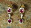 each claw set with an oval cut ruby within a surround of round brilliant cut diamonds, surmounting a line of three claw set similarly cut diamonds, and suspending another ruby and diamond set oval cluster drop, mounts stamped 750