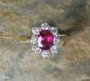 the central claw set oval cut ruby within a surround of round brilliant cut diamonds