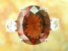 the central claw set oval cut deep red garnet, flanked to either side by a round brilliant cut diamond