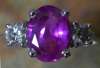 the central claw set oval cut deep pink sapphire flanked to either side by a round brilliant cut diamond