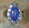the central oval cut sapphire of a soft violet-blue hue, within a pointed oval surround of old mine cut diamonds, flanked by foliate motifs to the shoulders