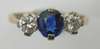 the central claw set oval cut sapphire flanked to either side by a round brilliant cut diamond