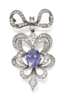 designed as a bow-tied ribbon, set with graduated round brilliant and single cut diamonds, suspending a detachable tapering drop, claw set to the centre with an oval cut sapphire of a pleasing violet hue, within a scroll surround also set with graduated single and round brilliant cut diamonds