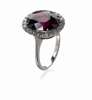 the central claw set oval cut garnet within a surround of round brilliant cut diamonds, mount stamped 750