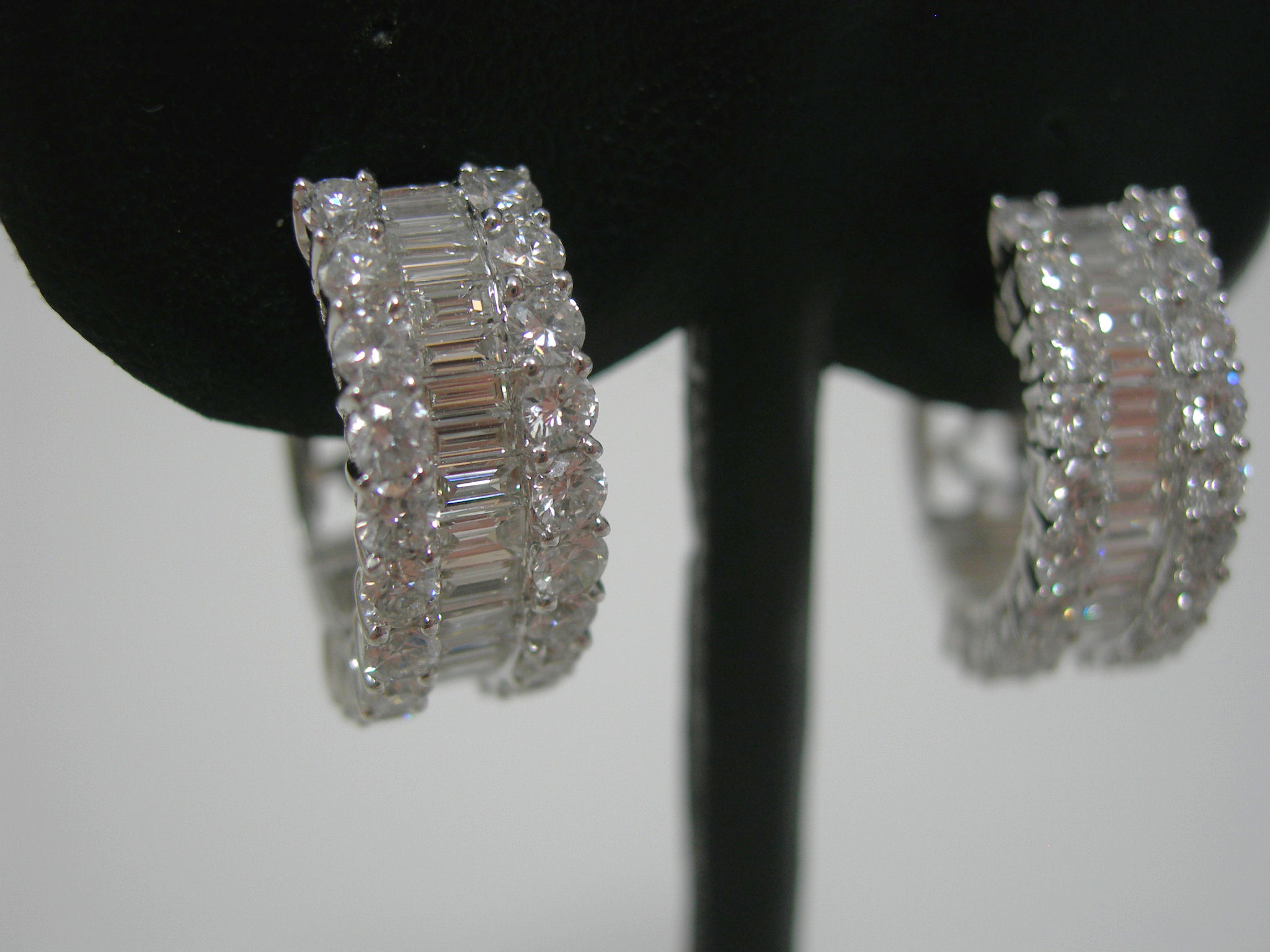 each of hinged hooped design, invisibly set to the front with a border of baguette cut diamonds, flanked to either side by borders of claw set round brilliant cut diamonds, mounts stamped 18K 750