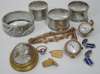 to include a Victorian gold mounted oval shell cameo brooch, carved with a classical soldier's portrait profile; a 9ct rose gold fancy link bracelet; two lady's 9ct gold wrist watches; a 9ct gold mounted amethyst set ring; a foliate engraved silver hinged bangle; two pairs of cufflinks and three engine turned silver napkin rings (11)