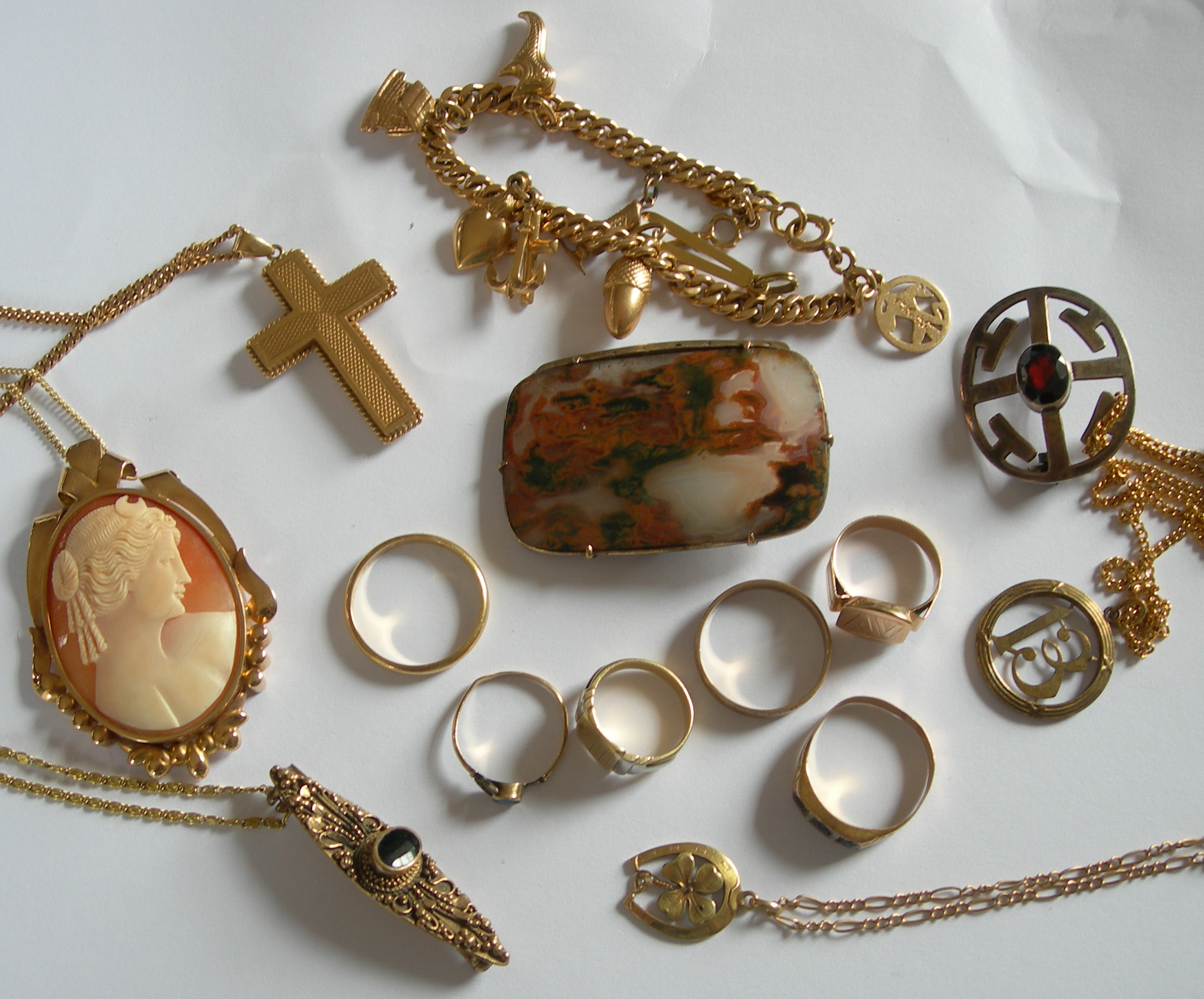to include a curb link charm bracelet, suspending eight assorted charms; a pendant mounted oval shell cameo, with trace link chain; an engine turned cross form pendant with flattened curb link chain; two wedding bands; assorted gem set rings and other items (Qty)