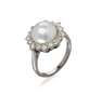 the central pearl, measuring approximately 10mm diameter, within a claw set surround of round brilliant cut diamonds