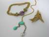 collet set with a pointed oval turquoise cabochon, suspending two graduated drops, spectacle set with rose cut diamonds, terminating in an oval cut turquoise cabochon and a bouton pearl, suspended from a trace link chain; a Victorian multi-gem set bracelet composed of three rows of belcher links with gem set clasp; also a 9ct gold seed pearl set brooch designed as a foliate spray (3)