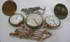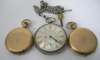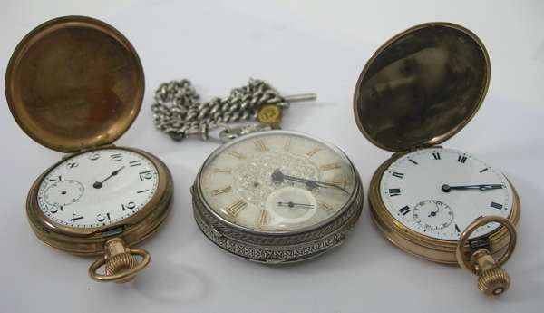 composed of fetter and three links; a silver open faced pocket watch with engraved dial and subsidiary seconds dial, with associated curb link silver Albert chain; also two gold plated hunter cased pocket watches (5)