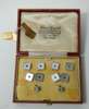 comprising four buttons, a pair of cufflinks and two studs, each with canted square terminals set with a French cut sapphire to a mother of pearl ground, contained in a fitted case stamped WILSON & SHARP LTD...; also a pair of 9ct gold rectangular cufflinks, conjoined by belcher links, crested, initialled and inscribed (2)