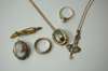 to include an Edwardian scroll form pendant set with an old European cut diamond and freshwater pearls, with trace link chain; a 9ct gold bouton pearl set ring (pearl untested); a colourless gem set full-eternity ring; an oval miniature portrait set brooch/pendant with chain; a 9ct white gold mounted oval shell cameo and marcasite set brooch; also a 9ct gold floral decorated bar brooch (6)