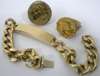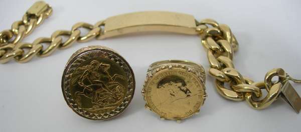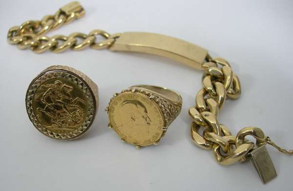 composed of flattened curb links, with concealed clasp and safety clip; a George V sovereign set ring, dated 1915 and an Edward VII half-sovereign set ring, dated 1908, mount stamped 9ct (3)