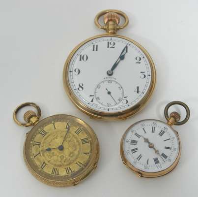 the white enamelled dial with black Arabic numerals and subsidiary seconds dial; a smaller fob watch stamped 18K; also another open faced pocket watch, with gilt dial, also stamped 18K (3)