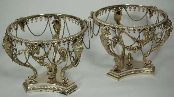 of circular outline with gadrooned rim supported by three goat's head mask supports on scroll foliate arms, with fruiting swags between and oval belcher link chain suspended, on shaped trefoil stepped base (2)