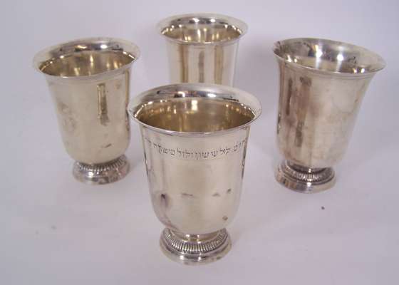 indistinctly marked, the deep bowl with everted rim and engraved with script border, on spreading foot rim with gadrooned detail; together with three similar plain examples (4)