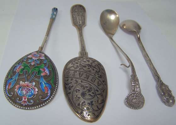an enamelled example with part twisted stem with enamel top section and final, the back of the tear drop shaped bowl with floral and foliate enamelled decoration with 84 mark , makers mark worn; a honey spoon with shaped floral finial curved slender stem with hook attached and simple pear shaped bowl makers mark A*M; a good gauge figural end spoon with two bear cubs and foliage and naturalistic stem to plan bowl, makers mark PJS; together with a Niello decorated Baltic Fiddle pattern table spoon by Y Butalov with niello decoration to reverse of handle stem and bowl and detail to obverse (4)