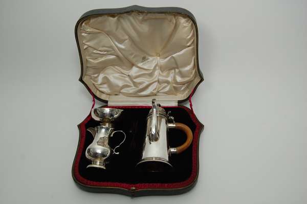 by Elkington and Company London 1906 - 07, comprising chocolate pot, sugar bowl and cream jug, the chocolate pot of flared simple form with scroll spout and simple C handle, the domed lid with simple finial and scroll thumbpiece, the sugar bowl of simple bellied form on stepped foot, the cream jug of baluster form with sparrow beak spout and S scroll handle, contained within fitted case